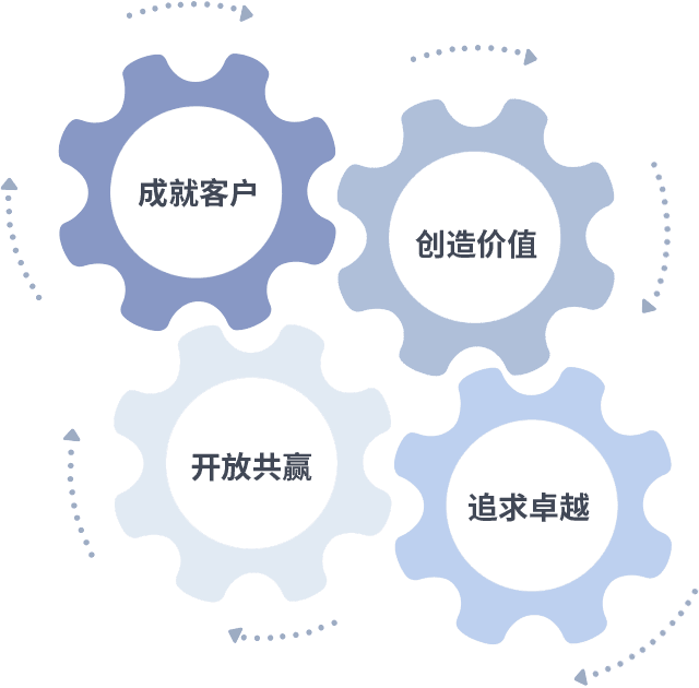 成就客户是一切决策的出发点,,创造价值是衡量所有工作的标准,,追求卓越是我们做事做人的态度,,,开放共赢是我们的格局也是最终的结果。。。价值观的齿轮环环相扣,,推动着组织里的每个人不断向前。。。